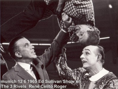 Charlie Chaplin y Celito Rivel, Rogelio Rivel, René Rivel |  | Ed Sullivan Show and the Trio Rivels René, Celito, Rogelio. 1965 Munich 1965 |  |  |  | Jorge Elias 7-2-1955 Hoja del Lunes CELITO Y ROGELIO ANDREU Perfiles circenses Han llegado a Barcelona, para tomarse unos días de descanso con los suyos, Celito y Rogelio Andreu, los famosos augustos internacionales. Han actuado durante un mes en Brighton (Inglaterra), encuadrados en una revista sobre hielo. Junto con René, el enharinado, desarrolaron ante el público inglés su número de clownes conocido por los 3 Rivels. Luego trabajaron en Londres, en la televisión, en un programa que tenía como base a nuestros compatriotas. El éxito en Inglaterra de los hermanos Andreu Rivels fue, como en todas partes, extraordinario. El mismo Charlie Chaplin, el verano pasado, en Lausanne, salió a la pista para abrazar, después de la representación, a los tres payasos. “Es usted mejor que yo”, dijo, modestamente, a Celito, quien, en su número de los trapecios volantes, había hecho su celebrada parodia del cineasta. “Te presento a tu tío”, añadió, humorísticamente, dirigiéndose a su hijo allí presente y refiriéndose al circense. Celito, con sus músculos faciales tensos, su voz cascada y grotesca, sus ademanes desenvueltos, tiene una comicidad temperamental, vigente incluso en su vida familiar. Rogelio, en cambio, que incorpora al segundo augusto, más inteligente, con menos exageración en el maquillaje y en la indumentaria, no permite descubrir, lejos de la pista, la existencia de un gran comediante, apto para provocar la risa. Su carácter es sosegado, tímido, melancólico, con una amargura incipiente traicionada por el surco naso-labial muy acusado. A través de su fidelísima devoción por su padre, por la esposa y por sus tres hijos de poca edad, da la versión renovada del payaso sentimental, sensible al dolor humano e implicado en un mecanismo profesional extraño a su temperamento. El número de clownes que explotan por todos los países resulta, al parecer, mucho más acabado que el presentado por Charlie, el hermano disidente, más lleno de matices y de intenciones, con una armonía rotunda procedente de la compenetración entre los tres artistas. Según pudimos comprobar durante el otoño pasado, Charlie Rivel, que sobresale especialmente en el grotesco de los trapecios, halla la dificultad, al realizar el número de los payasos, de no tener a su lado a unos artistas con quienes trabaje de antiguo. Los “partners” del mayor de los Andreu, a pesar de su categoría, no pueden captar las más puras esencias de las filigranas inventadas y enseñadas por el viejo patriarca Andreu. Procedente de Inglaterra, René ha ido a descansar a París, acompañado por su esposa. Luego se trasladará a Colonia, para reunirse allí con sus hermanos menores. Los tres Rivels van a empezar, a primeros de marzo, en Alemania, con el Circo Williams, una temporada que durará nueve meses. E. L. =============== 7-2-1955 Hoja del Lunes CELITO Y ROGELIO ANDREU Han llegado a Barcelona, para tomarse unos días de descanso con los suyos, Celito y Rogelio Andreu, los famosos augustos internacionales. Han actuado durante un mes en Brighton (Inglaterra), encuadrados en una revista sobre hielo. Junto con René, el enharinado, desarrolaron ante el público inglés su número de clownes conocido por los 3 Rivels. Luego trabajaron en Londres, en la televisión, en un programa que tenía como base a nuestros compatriotas. ========================= 4-8-1966 EL MUNDO DEPORTIVO EL CIRCO ACTUALIZADO El Circo Juvenil que se instaló en la Plaza Cataluña No es la primera vez que se instala un circo en plena plaza de Cataluña. Antes había allí uno permanente: eran otros tiempos y la misma urbanización de la plaza era diferente. Modernamente se hizo en plena Plaza de Cataluña una temporada de circo. Fue en el año 1944 para conmemorar la fecha de la terminación de la guerra. Se dio circo por todo lo alto, tres pistas actuando simultáneamente, un programa muy extenso, figuras de la categoría de los Rudi Llata y de los Rivels, a punto de emprender las giras por Europa que aún no han terminado. También en fecha más reciente hubo circo en la Plaza de Cataluña. Fue hace dos años, en plena primavera. Se instaló allí, al aire libre, una compañía venida de América: la de los universitarios de Tallahassee (Florida), la cual, durante dos días, dio funciones benéficas. Tales universitarios fueron por caminos inéditos: los de tomar el circo, aparte de hacerlo como diversión, como cultura. Los estudiantes, y principalmente los americanos, se entregan de lleno al deporte. Los de Tallahassee las emprendieron con el circo lo cual les permitió al igual que hacen los deportistas hacer sus viajecitos. El reverendo Silva también ha pisado y pisa caminos inéditos: los de dar a los muchachos de su “ciudad”, aparte de la cultura general y los estudios técnicos, una capacitación circense. Resulta difícil asegurar si, una vez crecidos estos muchachos y logrados unos conocimientos completos, ingresarán en el profesionalismo de lleno convertidos con la formación de familias circenses, en gentes de viaje. Lo cierto es que una parte de los residentes en la Ciudad de los Muchachos de Orense han estrenado profesión o actividad: la de artistas de circo, incipientes pero ya con resultados espléndidos. En “la Vanguardia”, del 28 de julio pasado, pudo leerse una noticia. Es la siguiente: “En la asamblea del “Ente Nazionale Circhi” en Milán se ha decidido crear un centro escuela para que los niños del circo puedan tener una educación circense completa – hasta ahora siempre muy defectuosa – teniendo al mismo tiempo una casa y un refugio para que puedan sentirse útiles y activos. La vida de caravana está perdiendo cada vez más el carácter patriarcal que la caracterizaba, y los niños no reciben más educación que la que se desarrolla e