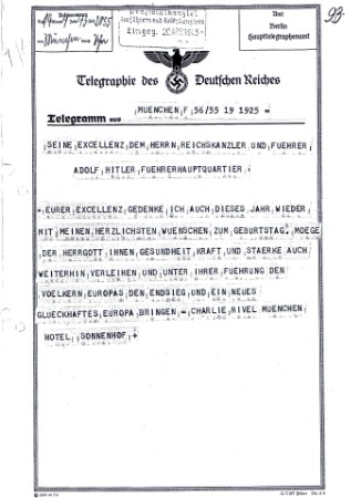 "Su excelencia como todos los anós reciba también este año mi efusiva felicitación de cumpleaños. Que el señor le siga colmando de salud, energía y fuerza y que bajo su mandato los pueblos europeos alcancen la victoria final y una Europa nueva y feliz. Charlie Rivel Munich Hotel Sonnenhof