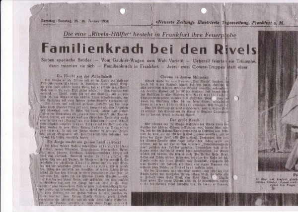 El 17 de Noviembre de 1935 empieza el primer proceso contra la familia Andreu a consecuencia de la denuncia tramitada por Charlie Rivel ante los tribunales nazis de Francfurt. Entre otras palabras relacionadas con la actividad de la familia, la denuncia tiene principalmente un claro objetivo, esto es, apropiarse del nombre Rivels utilizando todos los mecanismos legales disponibles.