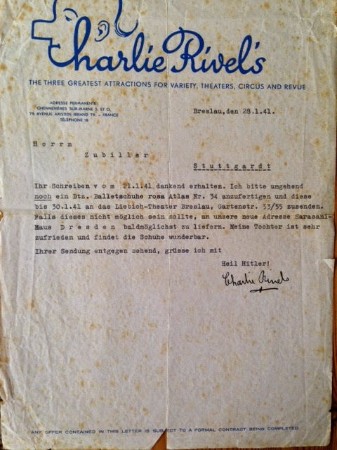 Para los admiradores que saven tando sobre el famosos Payasos del Siglo. cartas de Charlie Rivel ” firma con el saludo del nazi régimen 1941 y 1942. Lo que esto sinifica lo entiende un niño. esto es solo la punta del iceberg.